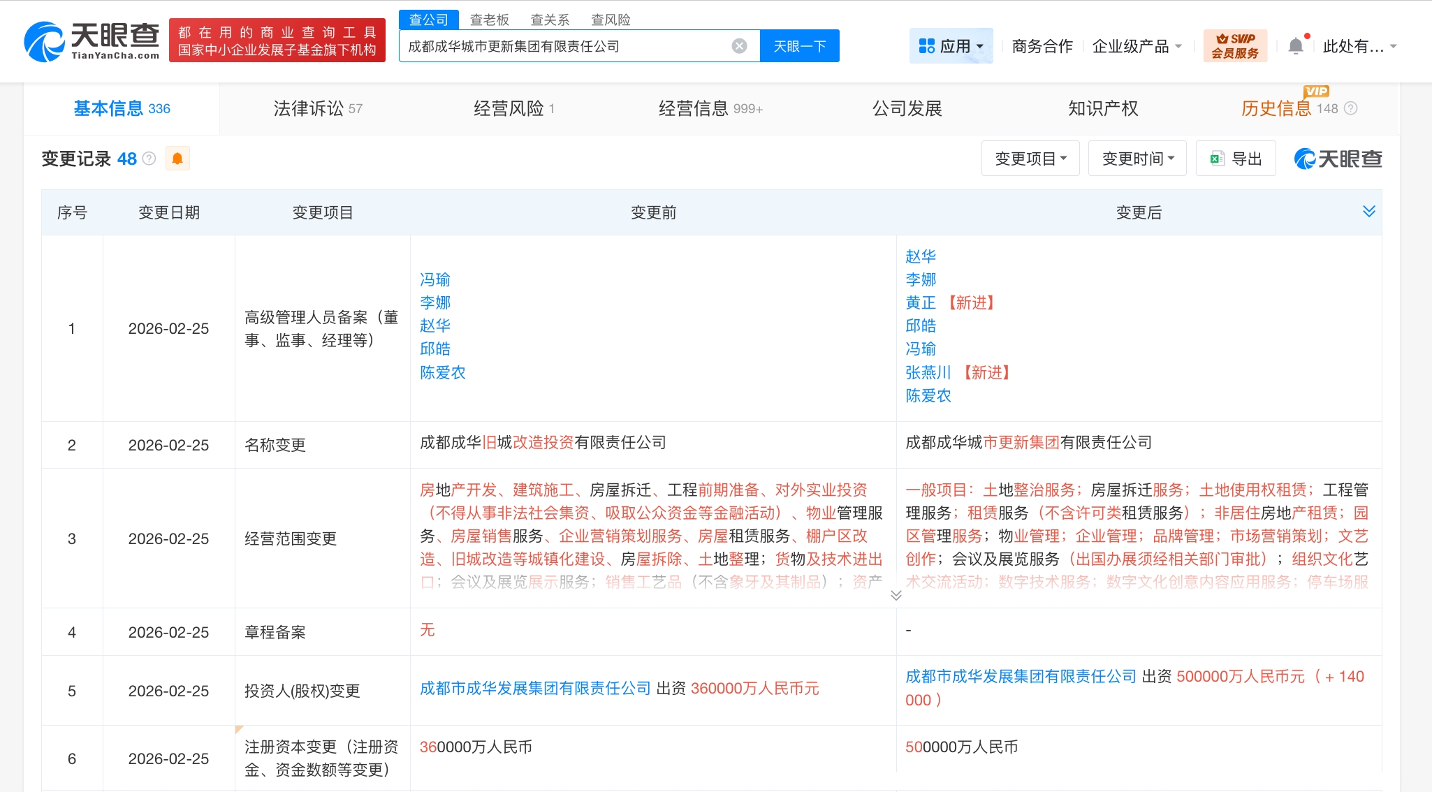 天眼查工商信息显示,近日,成都成华旧城改造投资有限责任公司发生工商变更,企业名称变更为成都成华城市更新集团有限责任公司,注册资本由36亿人民币增至50亿人民币,增幅约39%,同时,部分高管也发生变更。