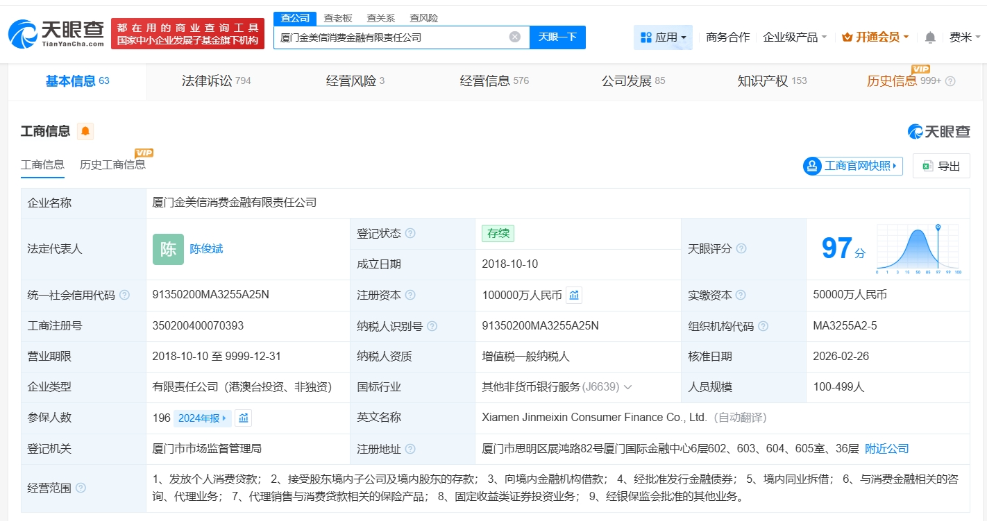厦门金美信消费金融有限责任公司成立于2018年10月,法定代表人为陈俊斌,经营范围包括发放个人消费贷款、接受股东境内子公司及境内股东的存款、向境内金融机构借款等。股东信息显示,该公司由中国信托商业银行股份有限公司、厦门金圆金控股份有限公司共同持股。