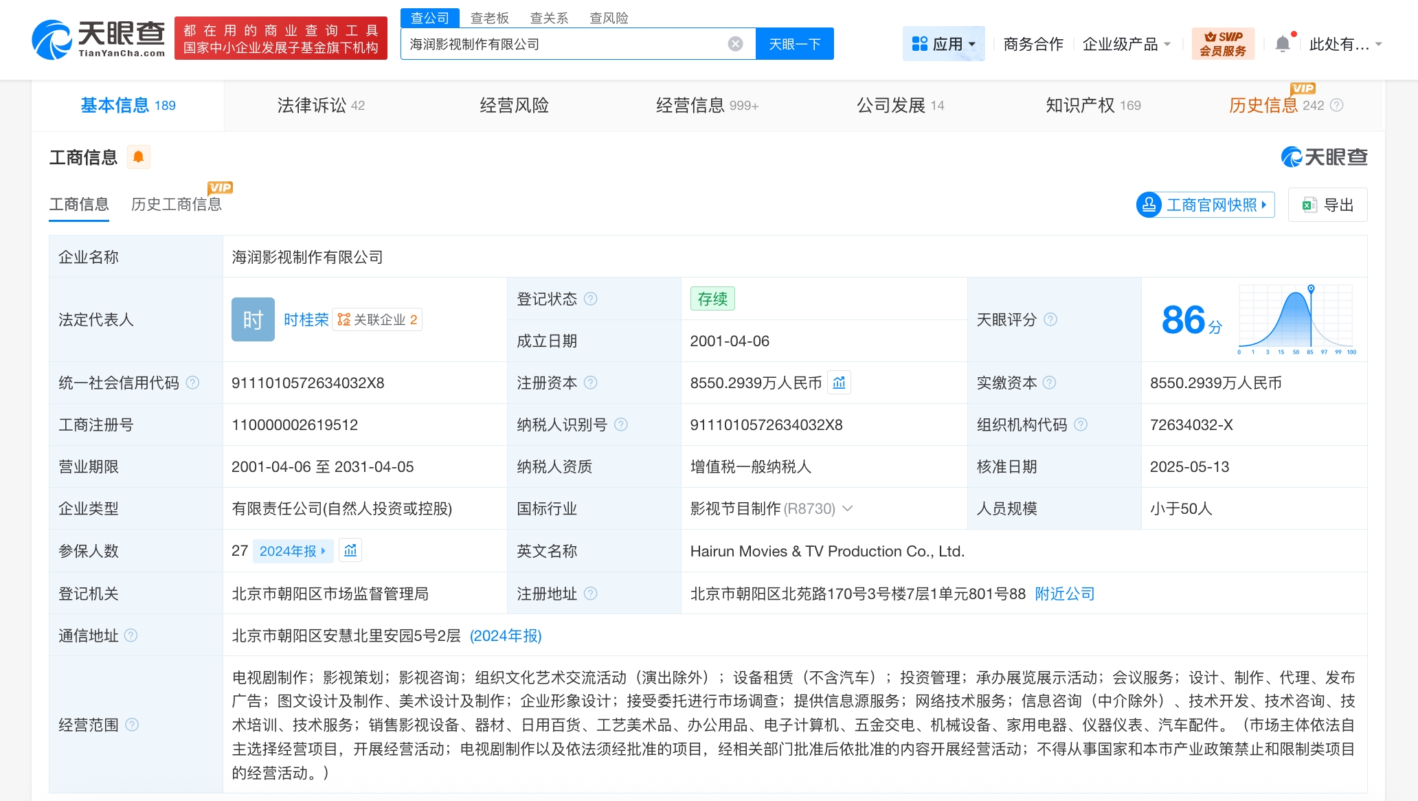 天眼查app显示,海润影视制作有限公司成立于2001年4月,法定代表人为时桂荣,注册资本约8550万人民币,经营范围包括电视剧制作,影视策划,影视咨询等。股东信息显示,该公司由刘燕铭、孙丽、郭峰等共同持股。