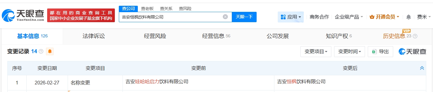 天眼查app显示,近日,吉安娃哈哈启力饮料有限公司发生工商变更,企业名称变更为吉安恒枫饮料有限公司。