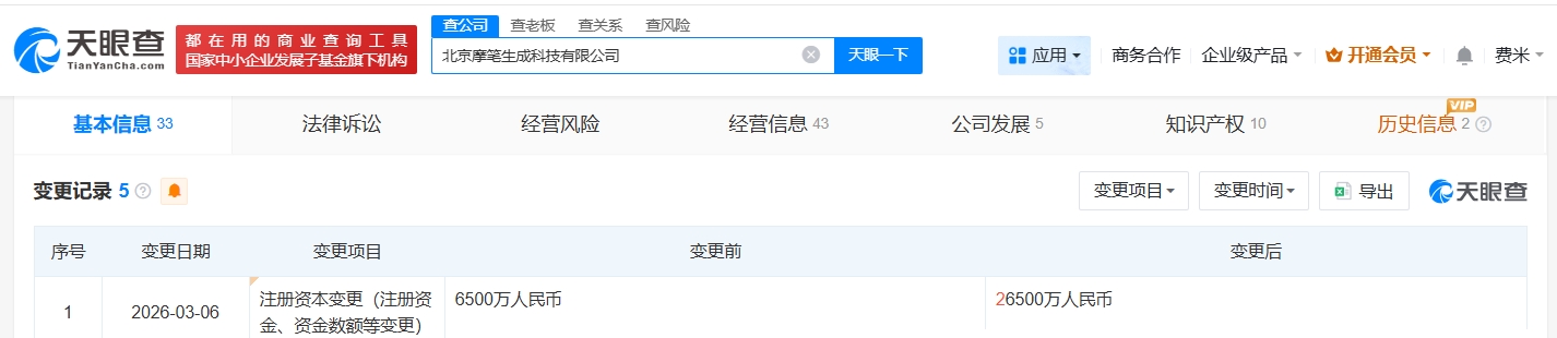 天眼查app显示,近日,北京摩笔生成科技有限公司发生工商变更,注册资本由6500万人民币增至2.65亿人民币,增幅约308%。