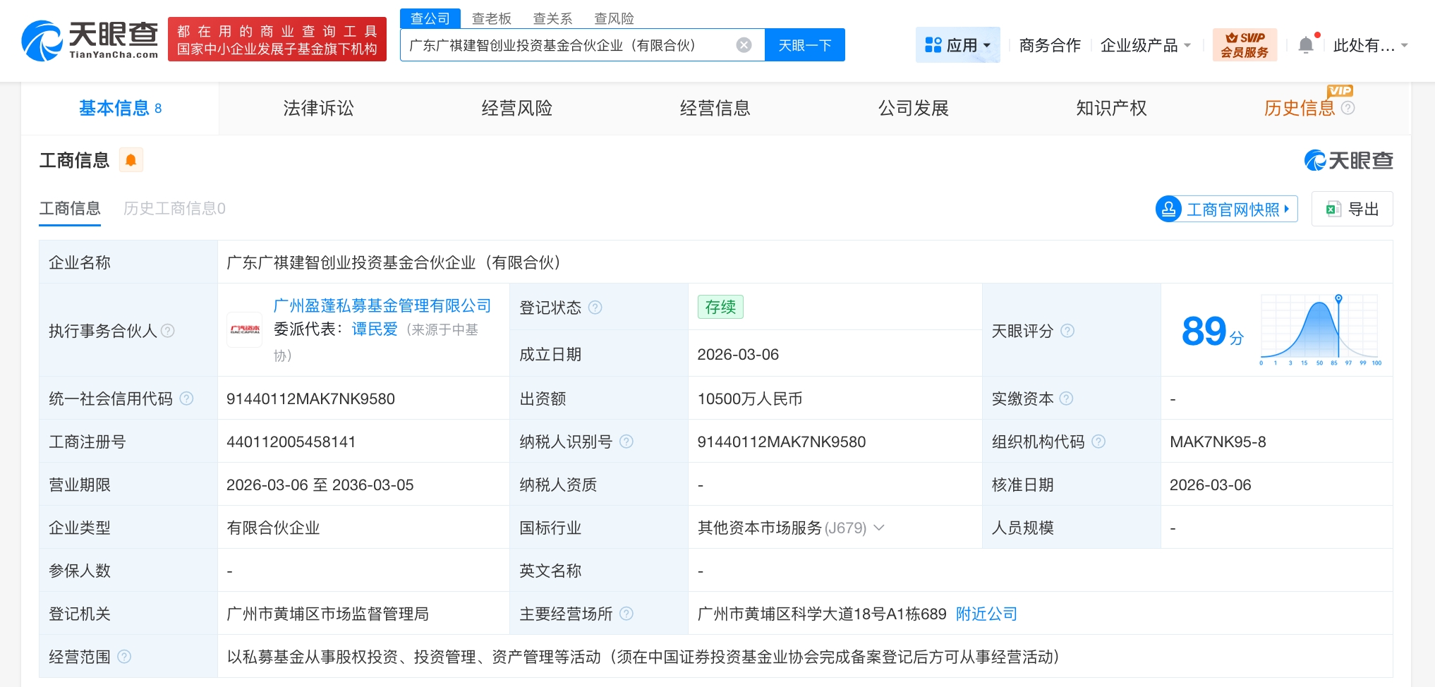 天眼查工商信息显示,近日,广东广祺建智创业投资基金合伙企业(有限合伙)成立,执行事务合伙人为广州盈蓬私募基金管理有限公司,出资额1.05亿人民币,经营范围为以私募基金从事股权投资、投资管理、资产管理等活动。合伙人信息显示,该基金由广州海智创业投资有限公司、广汽集团(601238)旗下广汽资本有限公司、海智投资(广州)有限公司、广州盈蓬私募基金管理有限公司、广州建智私募基金管理有限公司等共同出资。