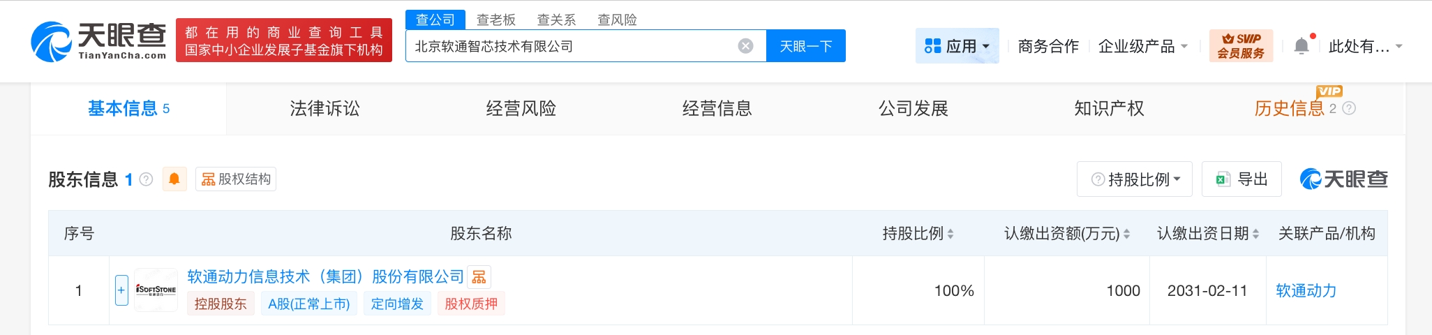 天眼查工商信息显示,近日,北京软通智芯技术有限公司成立,法定代表人为刘会福,注册资本1000万人民币,经营范围包含数字技术服务,技术服务、技术开发、技术咨询、技术交流、技术转让、技术推广,计算机系统服务,软件开发,信息系统集成服务等。股东信息显示,该公司由软通动力(301236)全资持股。
