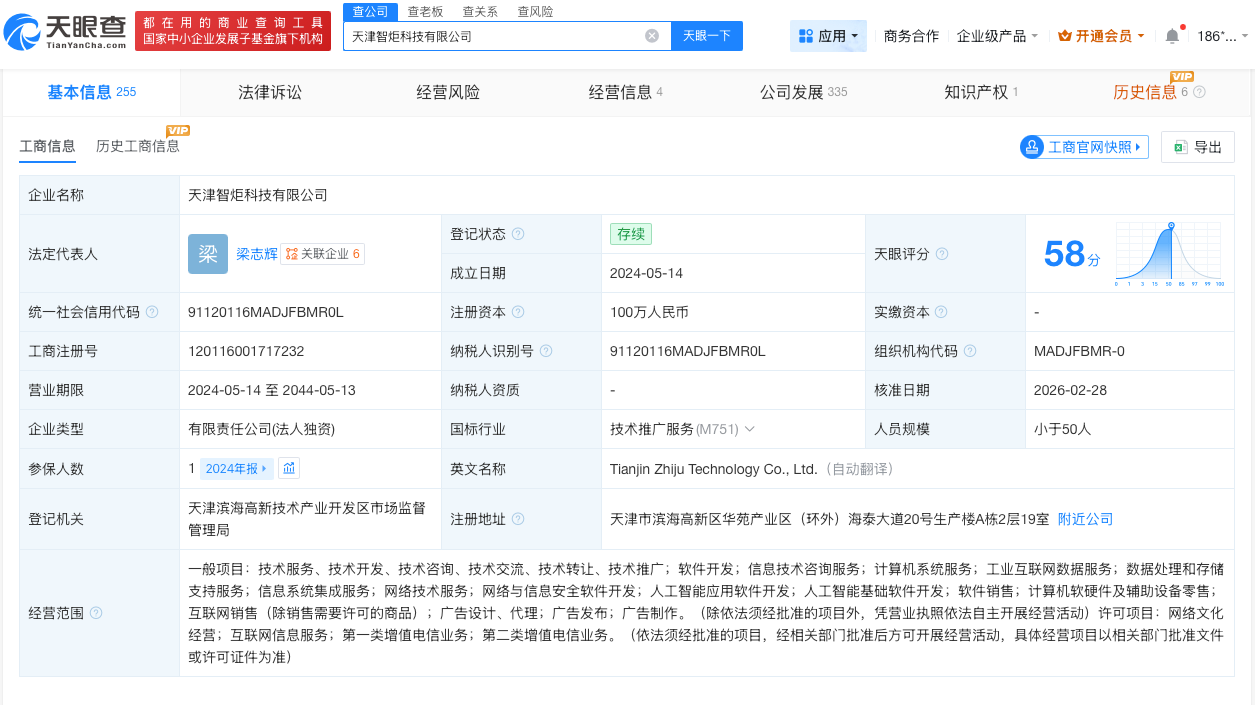 天眼查app显示,天津智炬科技有限公司成立于2024年5月,法定代表人为梁志辉,注册资本100万人民币,经营范围包括计算机系统服务、工业互联网数据服务、数据处理和存储支持服务等。股东信息显示,该公司由北京奇元科技有限公司全资持股。值得注意的是,周鸿祎为该公司实际控制人。