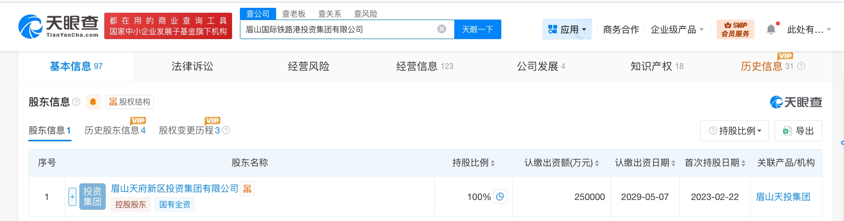 天眼查工商信息显示,近日,眉山国际铁路港投资集团有限公司发生工商变更,注册资本由10亿人民币增至25亿人民币,增幅150%。