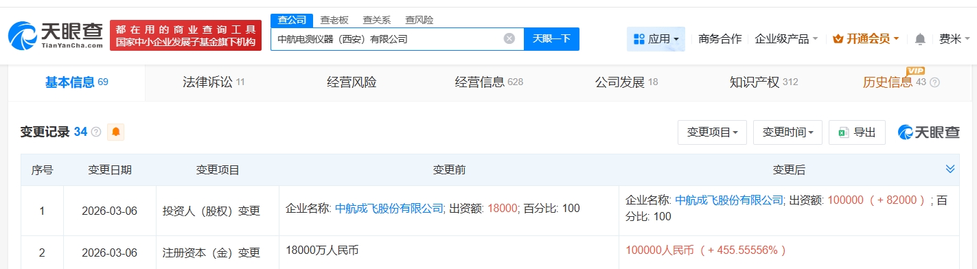 天眼查app显示,近日,中航电测仪器(西安)有限公司发生工商变更,注册资本由1.8亿人民币增至10亿人民币,增幅约456%。