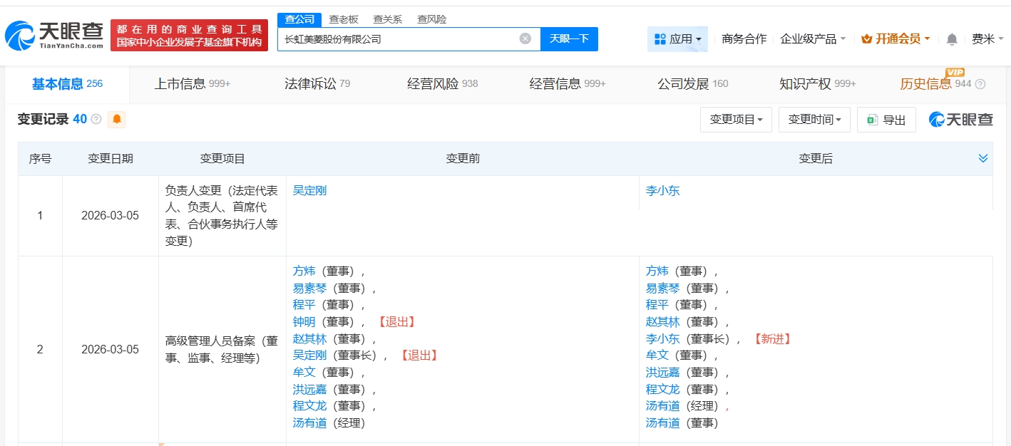 天眼查app显示,近日,长虹美菱(000521)发生工商变更,吴定刚卸任法定代表人、董事长,由李小东接任。同时,部分高管发生变更。