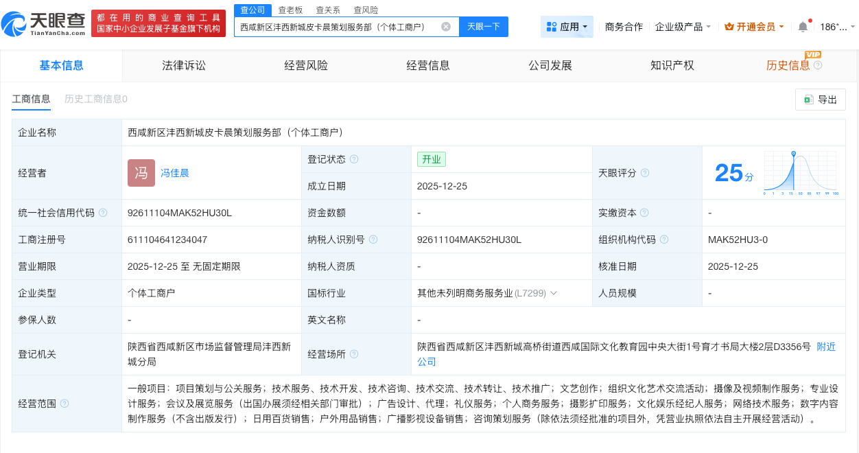 天眼查app显示,西咸新区沣西新城皮卡晨策划服务部(个体工商户)成立于去年12月,经营者为冯佳晨,经营范围包括项目策划与公关服务、摄影扩印服务、文化娱乐经纪人服务、网络技术服务等。