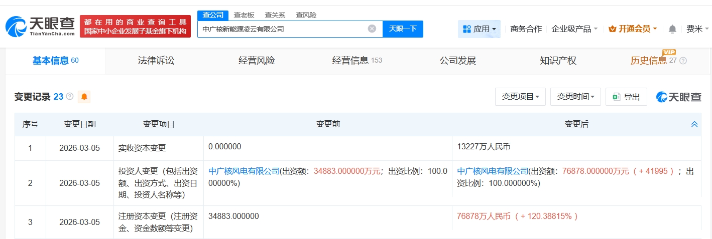 天眼查app显示,近日,中广核新能源凌云有限公司发生工商变更,注册资本由约3.5亿人民币增至约7.7亿人民币,增幅约120%。