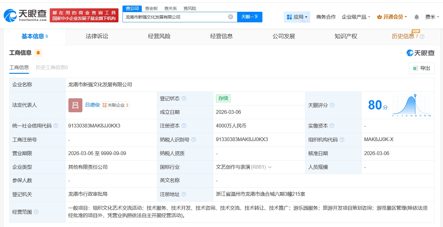 天眼查app显示,近日,龙港市新强文化发展有限公司成立,法定代表人为吕德俊,注册资本4000万人民币,经营范围包括组织文化艺术交流活动、游乐园服务、旅游开发项目策划咨询、游览景区管理等。股东信息显示,该公司由华强方特文化科技集团股份有限公司、龙港市新城建设发展集团有限公司共同持股。