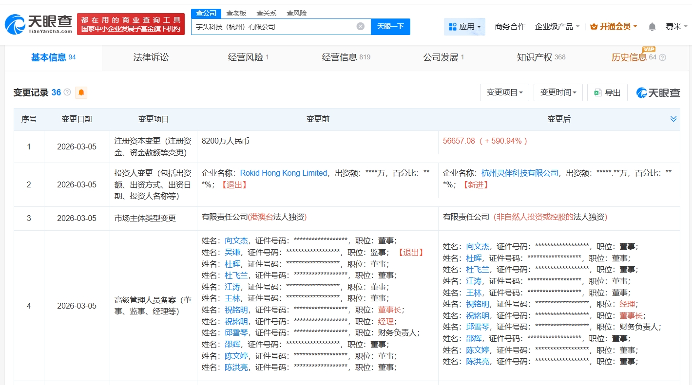 天眼查工商信息显示,近日,芋头科技(杭州)有限公司发生工商变更,原股东rokid hong kong limited退出,新增rokid关联公司灵伴科技(杭州)股份有限公司为股东。同时,注册资本由8200万人民币增至约5.7亿人民币,增幅约591%。