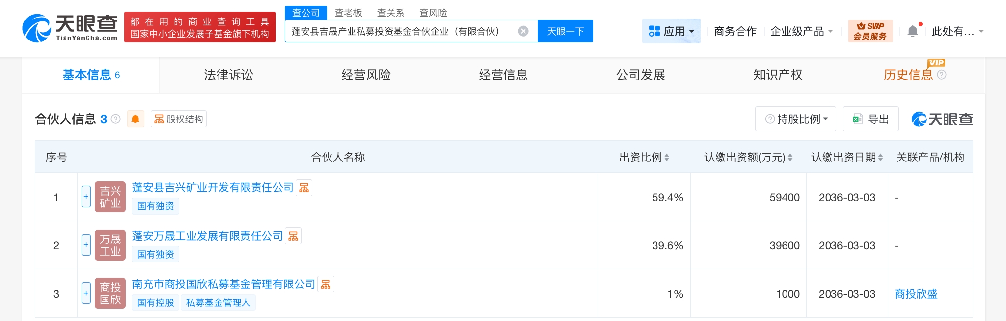 天眼查工商信息显示,近日,蓬安县吉晟产业私募投资基金合伙企业(有限合伙)成立,执行事务合伙人为南充市商投国欣私募基金管理有限公司,出资额10亿人民币,经营范围为以私募基金从事股权投资、投资管理、资产管理等活动。合伙人信息显示,该基金由蓬安县吉兴矿业开发有限责任公司、蓬安万晟工业发展有限责任公司、南充市商投国欣私募基金管理有限公司共同出资。