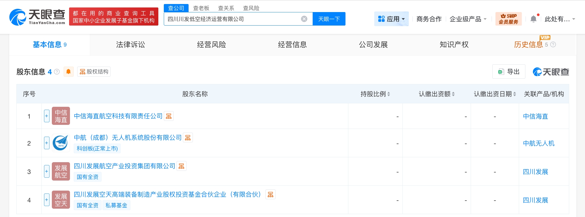 天眼查工商信息显示,近日,四川川发低空经济运营有限公司成立,法定代表人为王虎,注册资本1亿人民币,经营范围包括通用航空服务、航空运营支持服务、智能无人飞行器销售、人工智能行业应用系统集成服务、人工智能应用软件开发等。股东信息显示,该公司由四川发展航空产业投资集团有限公司、四川发展空天高端装备制造产业股权投资基金合伙企业(有限合伙)、中无人机(688297)、中信海直航空科技有限责任公司共同持股。