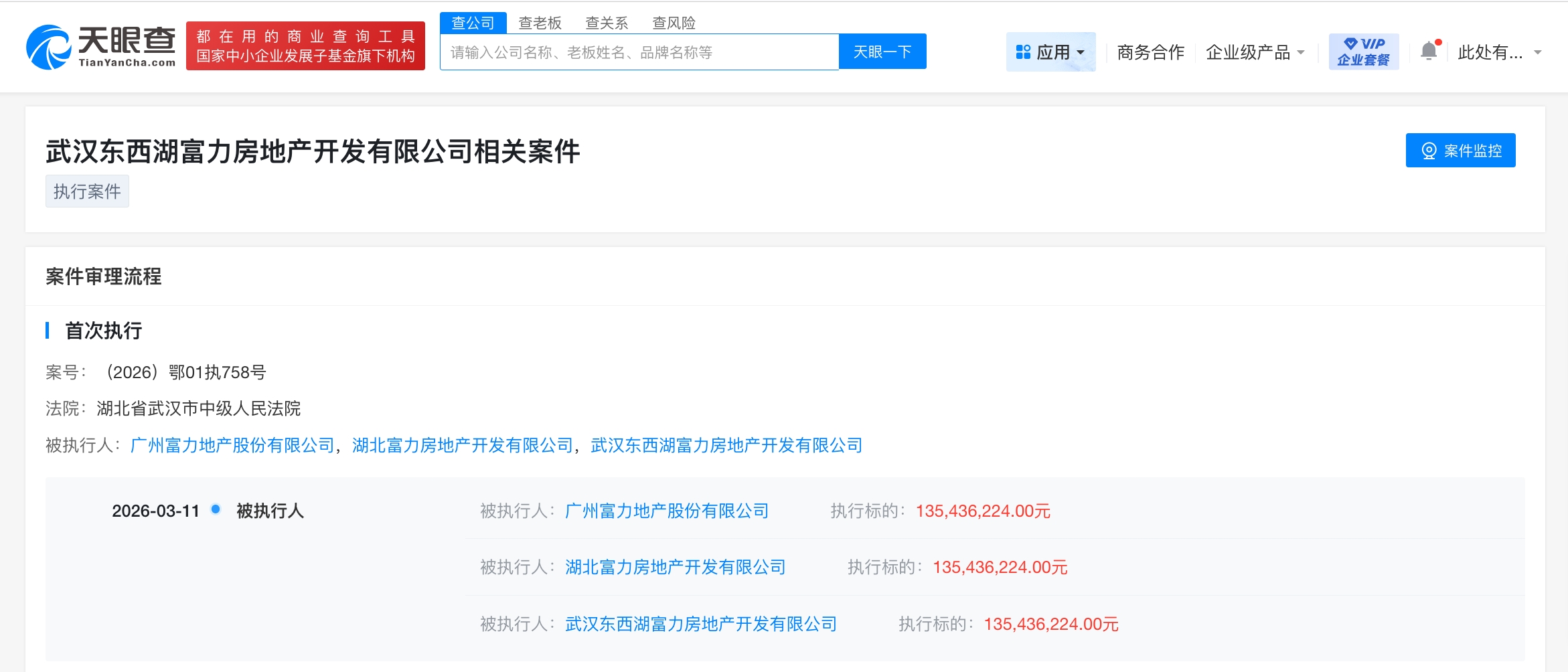 天眼查法律诉讼信息显示,近日,广州富力地产股份有限公司、武汉东西湖富力房地产开发有限公司等新增一则被执行人信息,执行标的约1.35亿余元,执行法院为湖北省武汉市中级人民法院。