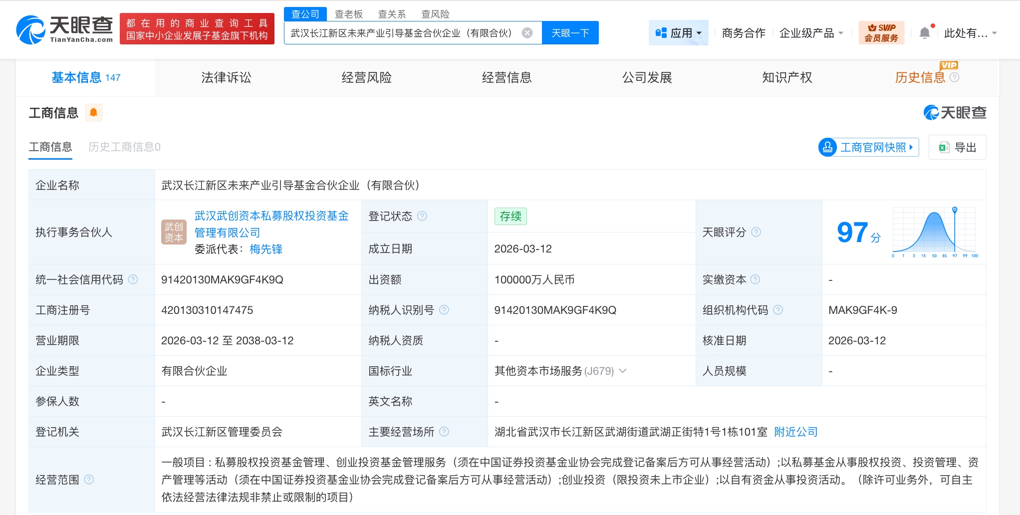 天眼查工商信息显示,近日,武汉长江新区未来产业引导基金合伙企业(有限合伙)成立,执行事务合伙人为武汉武创资本私募股权投资基金管理有限公司,出资额10亿人民币,经营范围为私募股权投资基金管理、创业投资基金管理服务,以私募基金从事股权投资、投资管理、资产管理等活动,创业投资,以自有资金从事投资活动。合伙人信息显示,该基金由武汉长江新区创新产业发展基金有限公司、武汉产业发展基金有限公司、武汉武创资本私募股权投资基金管理有限公司等共同出资。