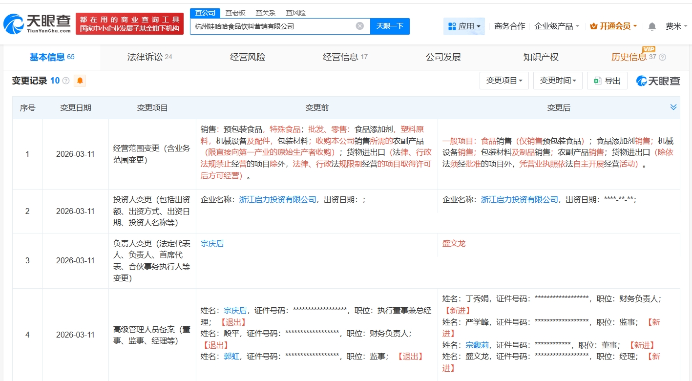 天眼查工商信息显示,近日,杭州娃哈哈食品饮料营销有限公司发生工商变更,宗庆后卸任法定代表人、执行董事兼总经理,盛文龙接任法定代表人、经理,宗馥莉接任董事。
