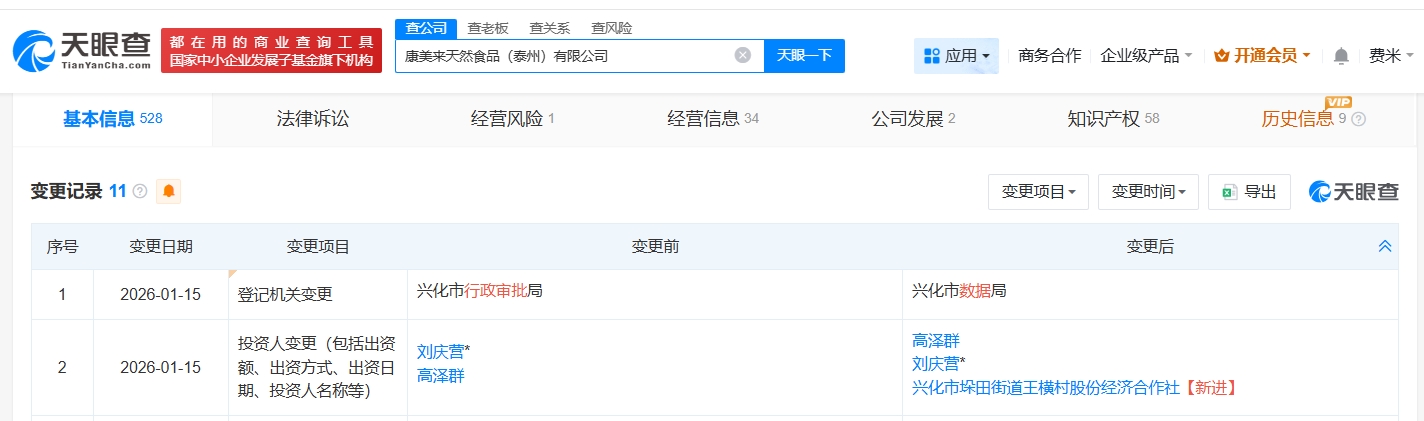 另一家涉事公司康美来天然食品(泰州)有限公司成立于2014年5月,法定代表人为刘庆营,注册资本100万人民币,经营范围包括预包装食品批发与零售、食品添加剂销售、自营和代理各类商品和技术的进出口业务等。变更记录显示,今年1月,该公司发生工商变更,新增兴化市垛田街道王横村股份经济合作社为股东。