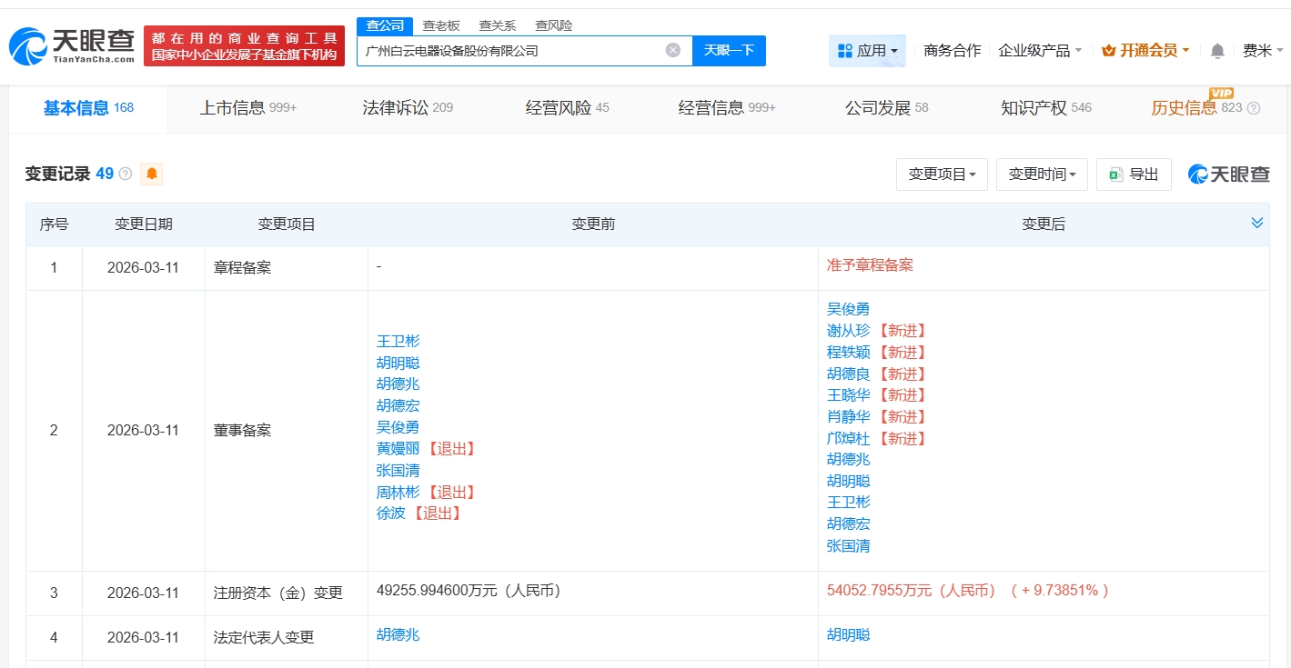 天眼查app显示,近日,白云电器(603861)发生工商变更,胡德兆卸任法定代表人,由胡明聪接任,同时,注册资本由约4.9亿人民币增至约5.4亿人民币,增幅约10%。