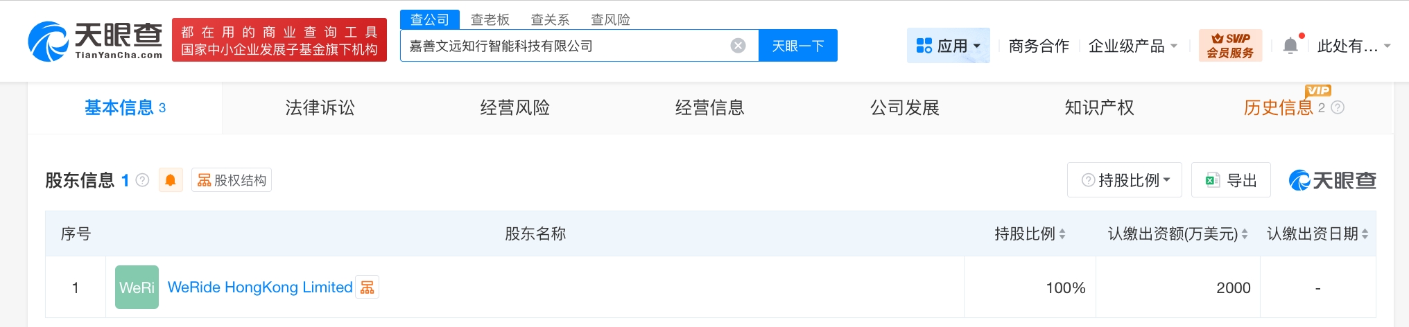 天眼查工商信息显示,近日,嘉善文远知行智能科技有限公司成立,法定代表人为韩旭,注册资本2000万美元,经营范围包括软件开发、人工智能基础软件开发、人工智能应用软件开发、智能机器人的研发、汽车销售、新能源汽车整车销售等。股东信息显示,该公司由文远知行旗下weride hongkong limited全资持股。