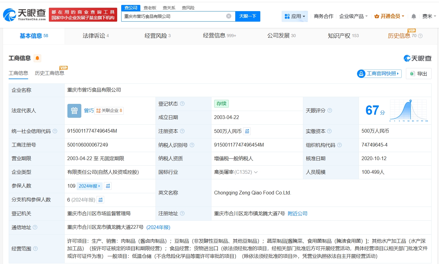 天眼查任职信息显示,曾巧名下关联8家企业,其中4家企业处于存续状态,包括乖媳妇鸡爪关联公司重庆市曾巧食品有限公司、重庆欧比亚防腐工程有限公司等,曾巧在乖媳妇鸡爪关联公司担任执行董事兼经理、法定代表人并持有该公司股份,其他4家企业已注销或被吊销。