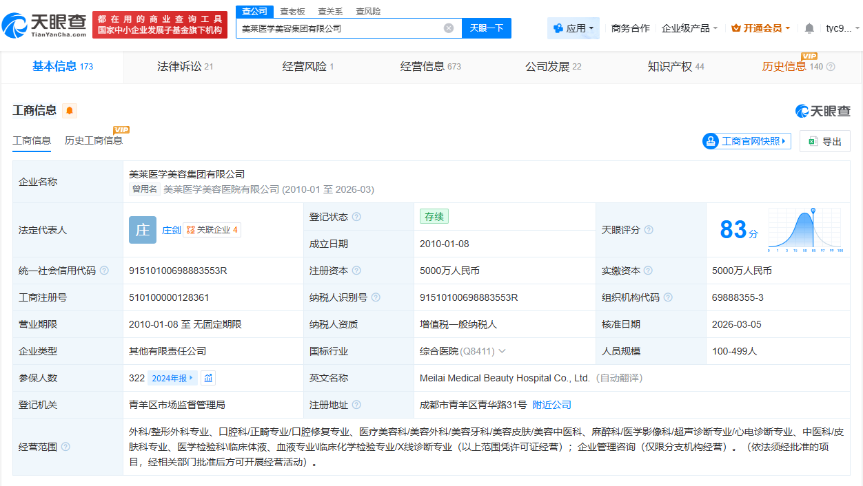 天眼查app显示,美莱医学美容集团有限公司成立于2010年1月,法定代表人为庄剑,注册资本5000万人民币,经营范围包括外科、整形外科专业、口腔科等,由上海美莱投资管理有限公司、陈金秀共同持股。对外投资显示,该公司对外投资49家企业,其中38家为存续状态,包括健信康融商业保理(厦门)有限公司、上海美莱医疗美容门诊部有限公司等。周边风险信息显示,该公司旗下的佛山市美莱医疗美容医院有限公司、厦门美莱医疗美容门诊部有限公司等多家公司曾被处罚。