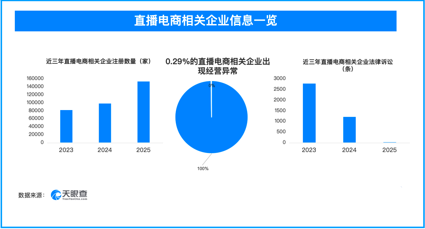 天眼查天眼风险显示,从事直播电商相关业务的企业中,有3600余家相关企业曾出现法律诉讼,0.29%的相关企业曾出现经营异常,0.32%的相关企业曾出现行政处罚。据天眼查深度风险数据显示,100余家直播电商相关企业现存被执行人信息,占比0.02%。