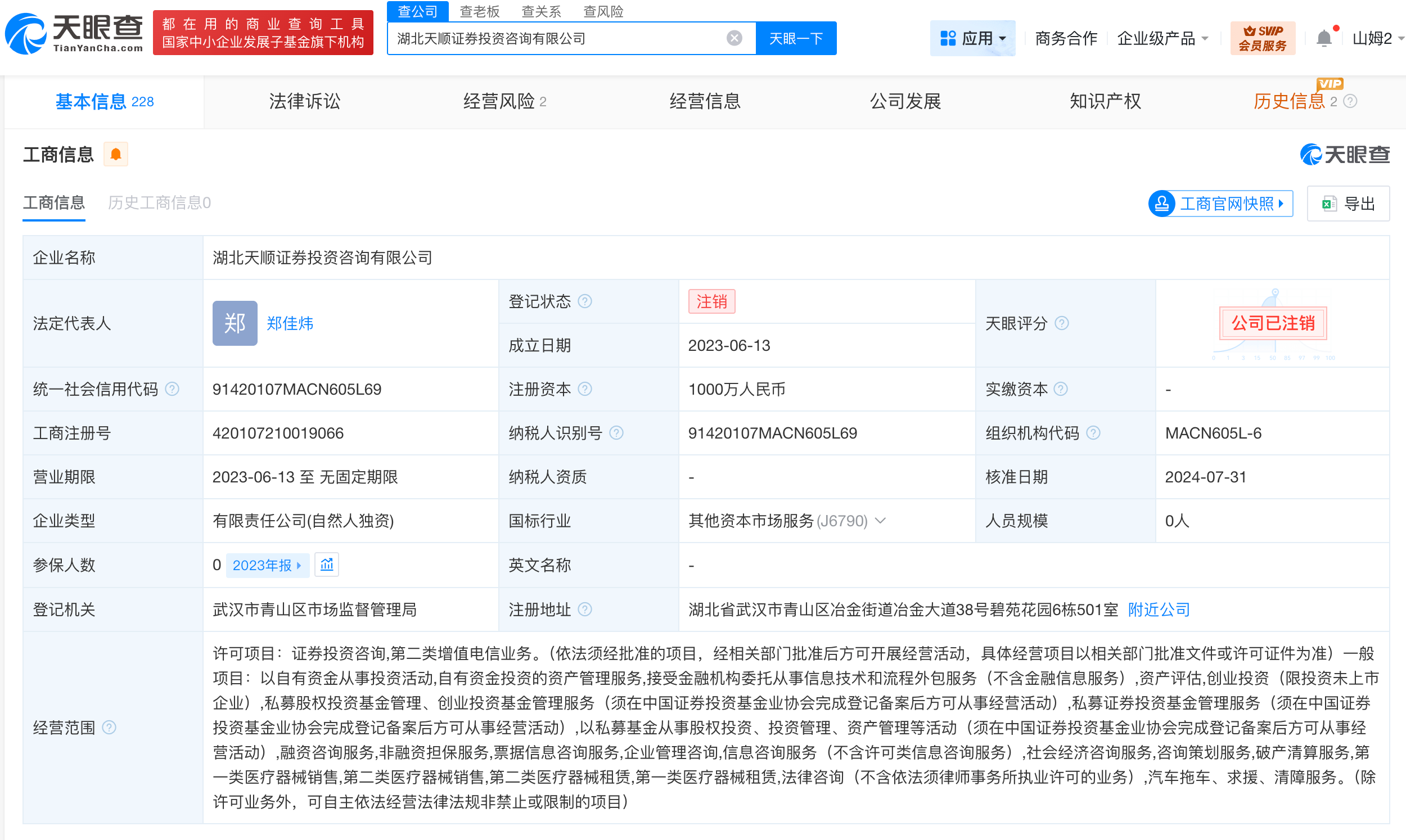 天眼查app显示,“湖北天顺私募”冒名公司湖北天顺证券投资咨询有限公司成立于2023年6月,法定代表人为郑佳炜,注册资本1000万人民币,经营范围包括证券投资咨询、第二类增值电信业务、以自有资金从事投资活动等,由郑佳炜全资持股。值得注意的是,该公司已于2024年7月注销。