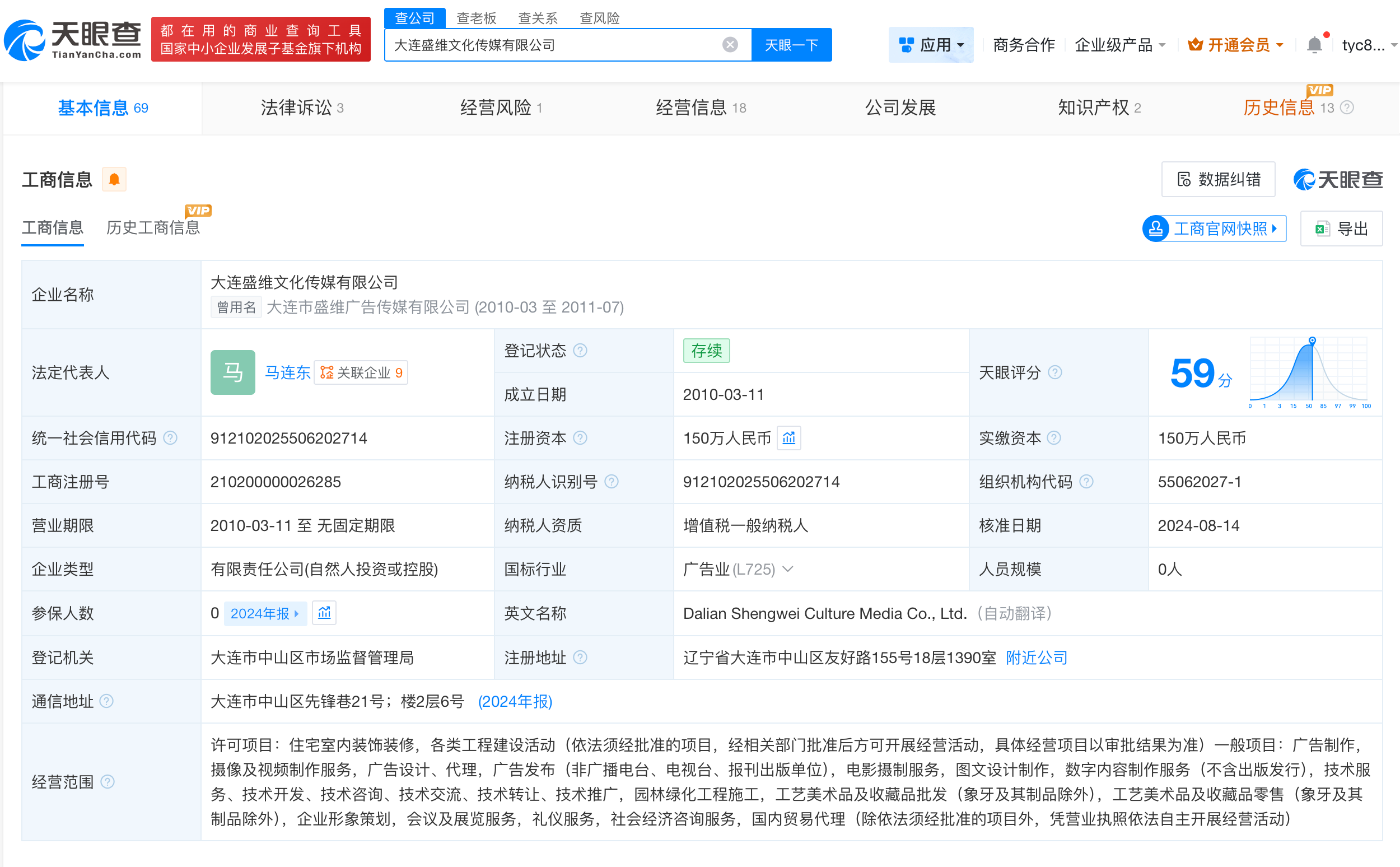 天眼查app显示,大连盛维文化传媒有限公司成立于2010年3月,法定代表人为马连东,注册资本150万人民币,经营范围包括住宅室内装饰装修、各类工程建设活动、广告制作等,由马连东、王琦共同持股。参保人数信息显示,该公司2024年参保人数为0。知识产权信息显示,该公司申请的广告销售、方便食品类“五行乏康”商标均已无效。