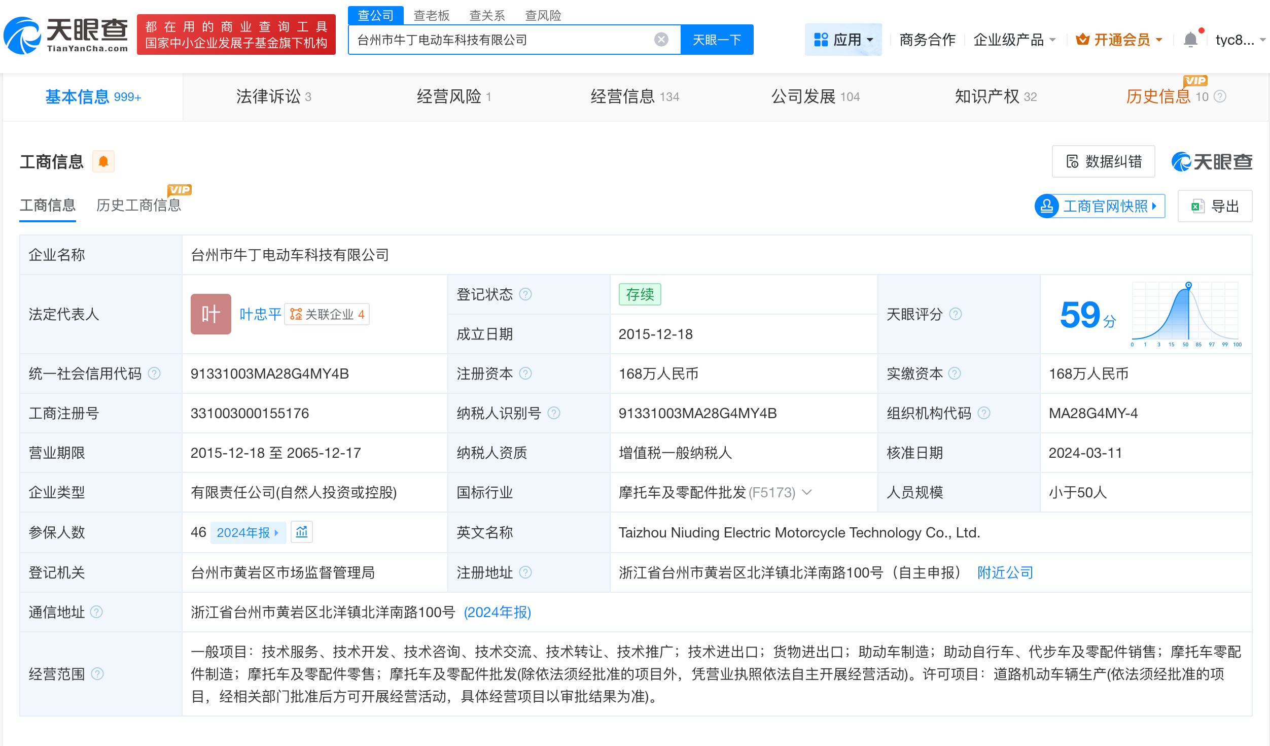天眼查app显示,台州市牛丁电动车科技有限公司成立于2015年12月,法定代表人为叶忠平,注册资本168万人民币,经营范围包括货物进出口、助动车制造、摩托车零配件制造等,由叶忠平、王文庆、陈连胜、刘起武共同持股。经营风险信息显示,此前,该公司曾召回部分牛丁牌电动自行车,召回原因涉及整车质量、蓄电池防篡改项目不符合标准要求,消费者在使用时存在可能引起交通事故和火灾的风险。法律诉讼信息显示,该公司曾涉及财产损害赔偿纠纷、买卖合同纠纷。对外投资信息显示,去年6月,该公司成立了台州市牛丁进出口有限公司。分支机构信息显示,今年1月,该公司成立了台州市牛丁电动车科技有限公司头陀分公司。
