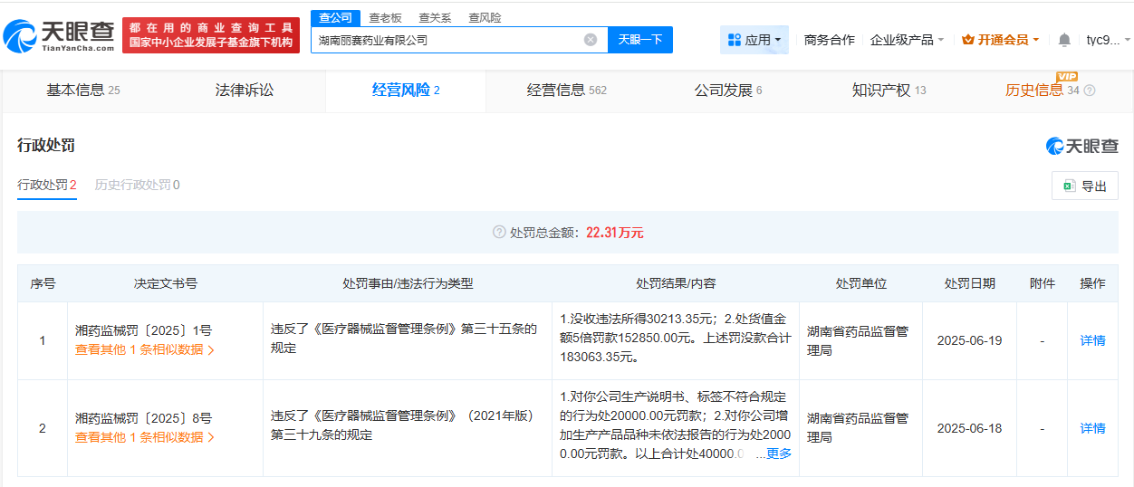 天眼查app显示,湖南丽赛药业有限公司成立于2021年6月,法定代表人为肖景阳,注册资本300万人民币,经营范围包括医疗器械技术开发、健康医疗产业项目的管理等,由肖爽、肖景阳。行政处罚信息显示,2025年6月,该公司因违反了《医疗器械监督管理条例》相关规定,被湖南省药品监督管理局罚没合计22万余元。