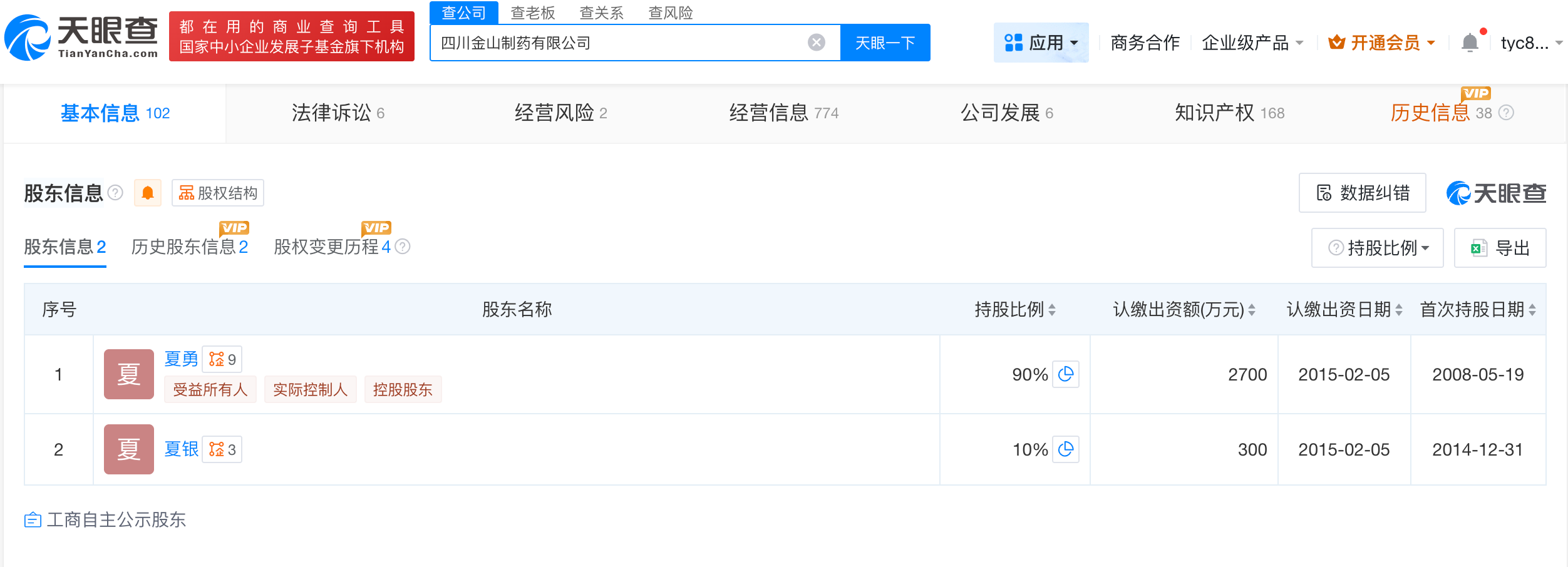 天眼查app显示,四川金山制药有限公司成立于2008年5月,法定代表人为李华东,注册资本3000万人民币,经营范围包括药品生产、食品添加剂生产、消毒剂生产等,由夏勇、夏银共同持股。经营风险信息显示,该公司现存两条环保处罚信息。双随机抽查信息显示,2023年6月,该公司在四川省生态环境厅“企业环境统计工作抽查”中,检查结果为发现问题已责令改正。