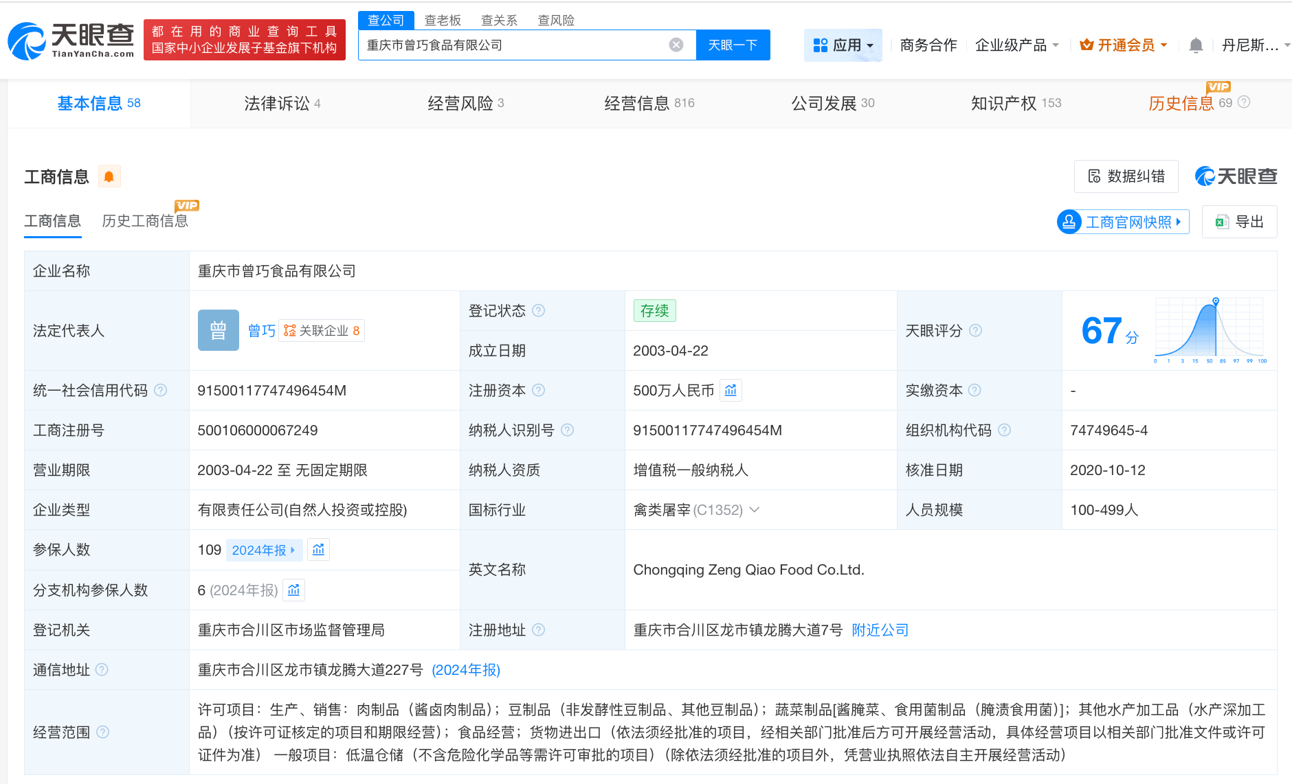 天眼查app显示,重庆市曾巧食品有限公司成立于2003年4月,法定代表人为曾巧,注册资本500万人民币,经营范围包括生产、销售:肉制品,豆制品,蔬菜制品等,由高家琴、曾巧共同持股。天眼风险信息显示,2023年7月、2025年2月,该公司分别因生产经营超范围、超限量使用食品添加剂的食品、生产经营腐败变质、油脂酸败、霉变生虫、污秽不洁、混有异物、掺假掺杂或者感官性状异常的食品、食品添加剂的行为,被重庆市合川区市场监督管理局罚款。此外,2021年6月,该公司在抽查检查中,被发现问题已责令改正。
