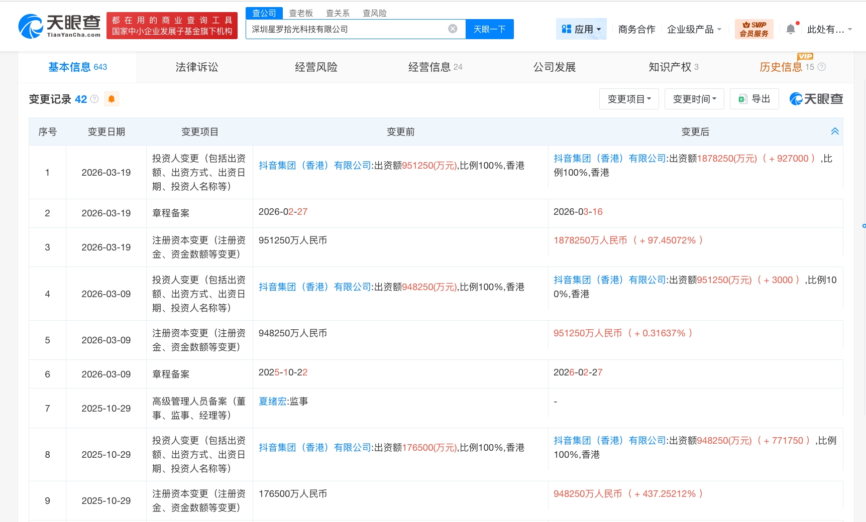 天眼查工商信息显示,近日,深圳星罗拾光科技有限公司发生工商变更,注册资本由约95.1亿人民币增至约187.8亿人民币,增幅约97%。