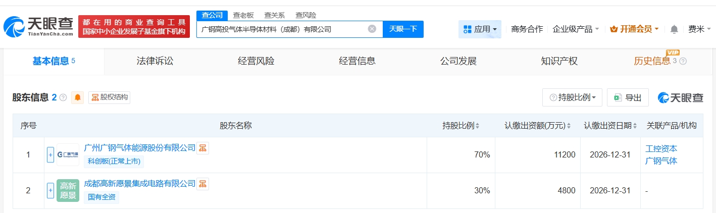 天眼查app显示,近日,广钢高投气体半导体材料(成都)有限公司成立,法定代表人为林宇发,注册资本1.6亿人民币,经营范围包括专用化学产品制造、电子专用材料制造、化工产品销售等。股东信息显示,该公司由广钢气体(688548)、成都高新愿景集成电路有限公司共同持股。