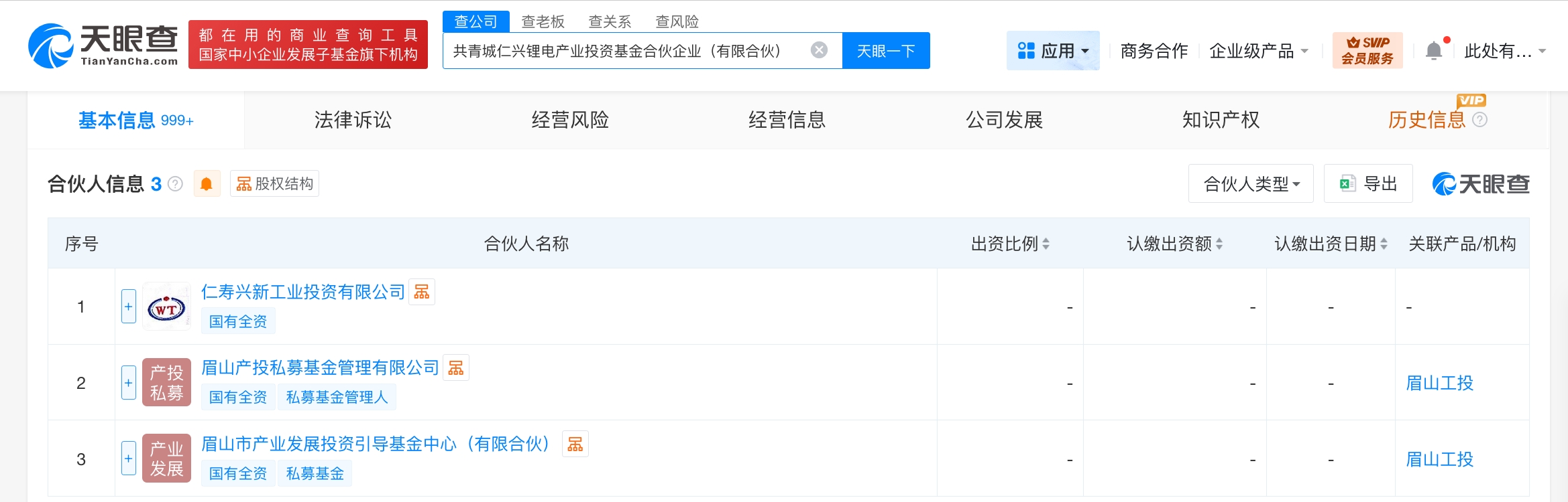 天眼查工商信息显示,近日,共青城仁兴锂电产业投资基金合伙企业(有限合伙)成立,执行事务合伙人为眉山产投私募基金管理有限公司,出资额8.5亿人民币,经营范围为以私募基金从事股权投资、投资管理、资产管理等活动,创业投资。合伙人信息显示,该基金由仁寿兴新工业投资有限公司、眉山市产业发展投资引导基金中心(有限合伙)、眉山产投私募基金管理有限公司共同出资。