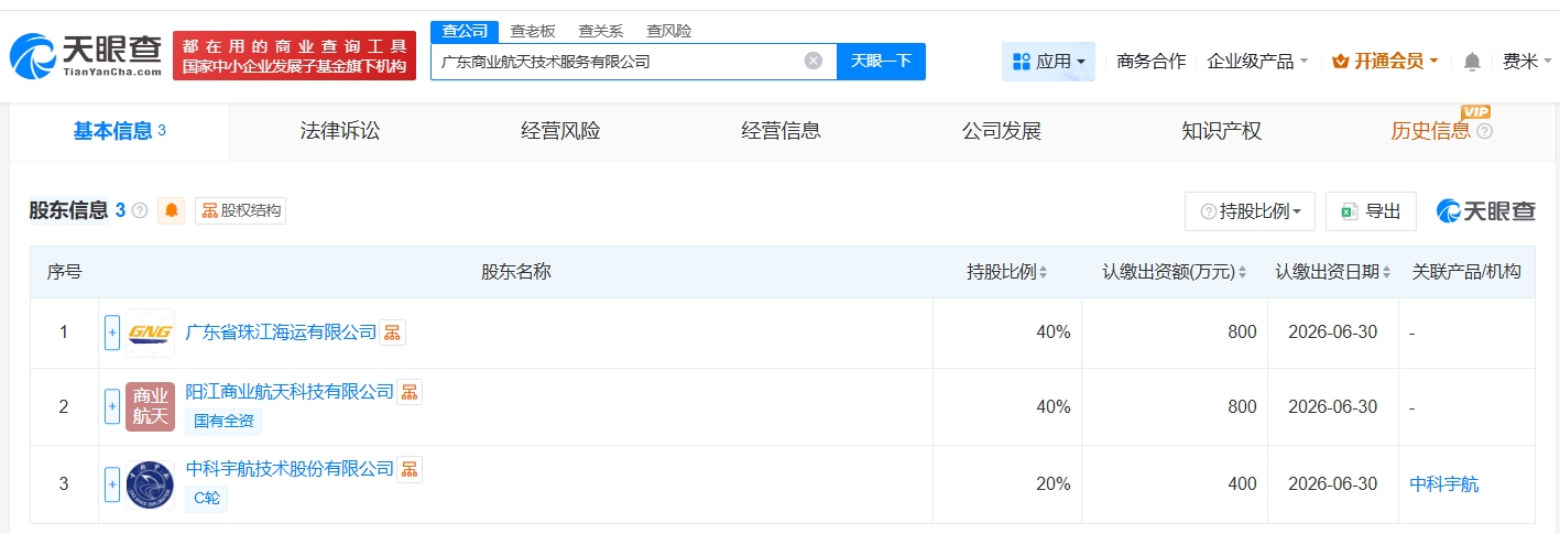 天眼查app显示,近日,广东商业航天技术服务有限公司成立,法定代表人为何健荣,注册资本2000万人民币,经营范围含民用航天发射技术服务、卫星遥感数据处理、卫星导航服务等。股东信息显示,该公司由广东省珠江海运有限公司、阳江商业航天科技有限公司、中科宇航技术股份有限公司共同持股。