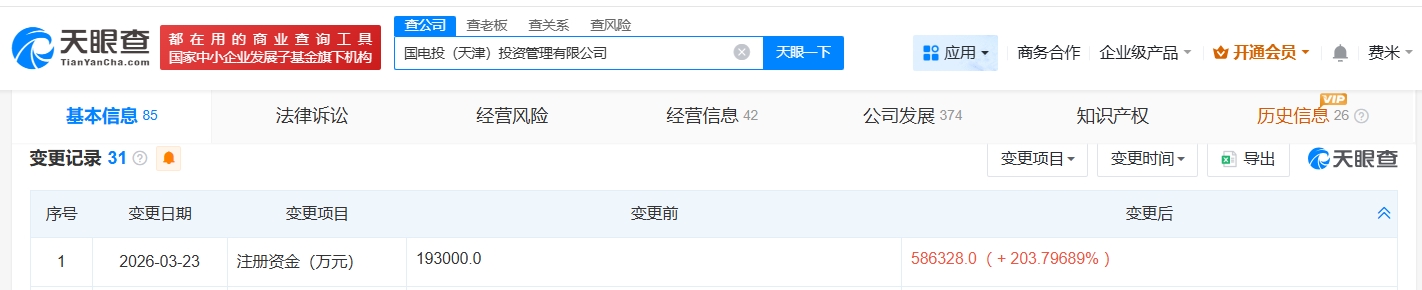 天眼查app显示,近日,国电投(天津)投资管理有限公司发生工商变更,注册资本由19.3亿人民币增至约58.6亿人民币,增幅约204%。