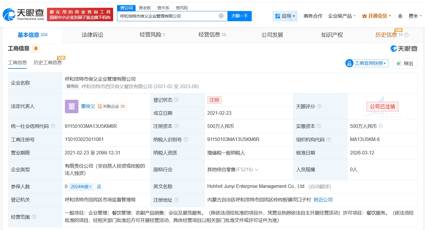 呼和浩特市俊义企业管理有限公司成立于2021年2月,法定代表人为董俊义,注册资本500万人民币,经营范围包括企业管理、餐饮管理、农副产品销售等。股东信息显示,该公司由内蒙古西贝餐饮集团有限公司全资持股。