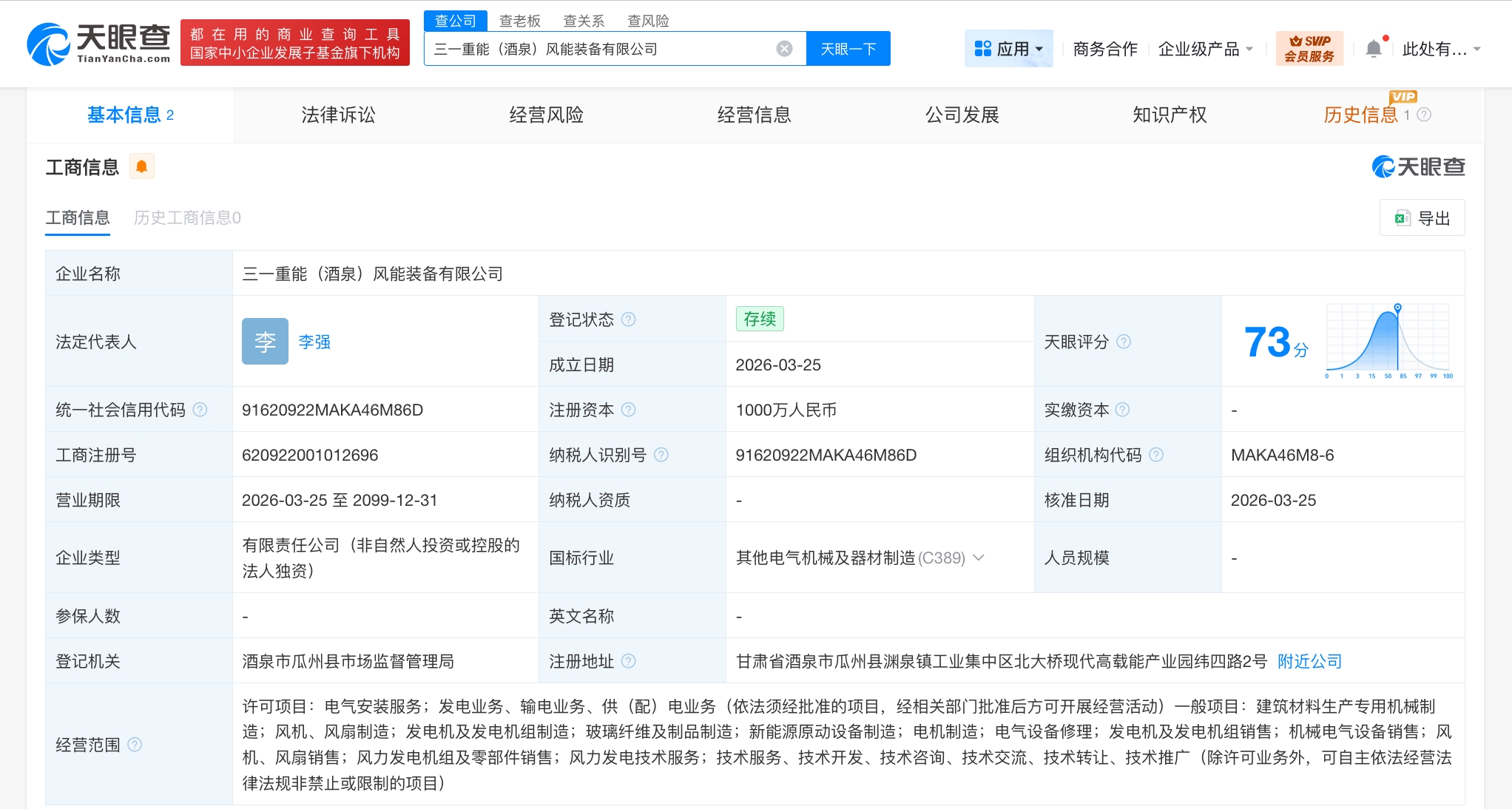 天眼查工商信息显示,近日,三一重能(酒泉)风能装备有限公司成立,法定代表人为李强,注册资本1000万人民币,经营范围包括风机、风扇制造,发电机及发电机组制造,玻璃纤维及制品制造,新能源原动设备制造,风力发电机组及零部件销售,风力发电技术服务等。股东信息显示,该公司由三一重能(688349)全资持股。