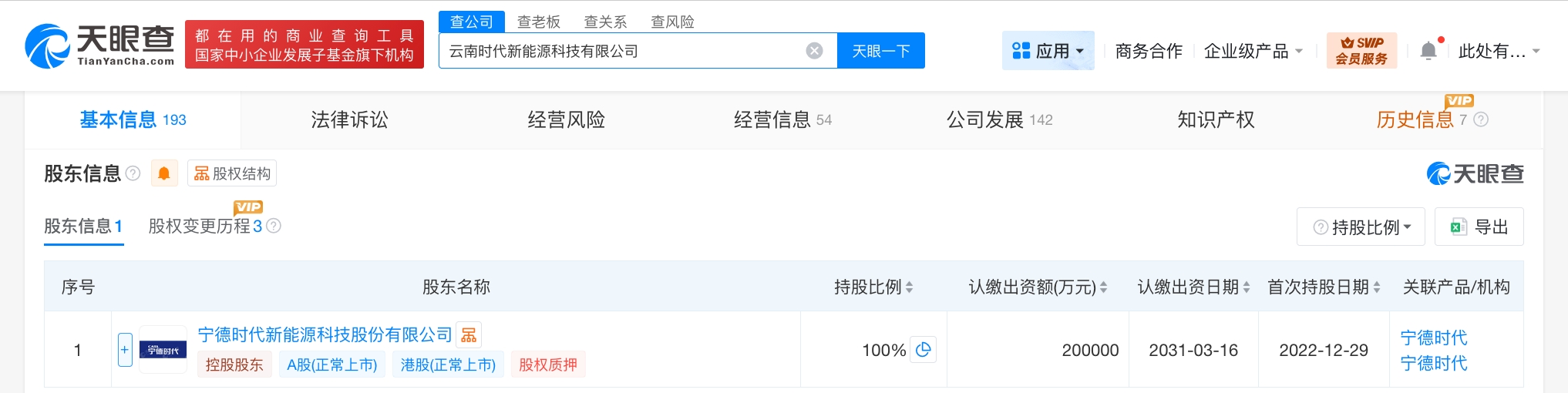 天眼查工商信息显示,近日,云南时代新能源科技有限公司发生工商变更,注册资本由10亿人民币增至20亿人民币,增幅100%,同时,部分高管也发生变更。