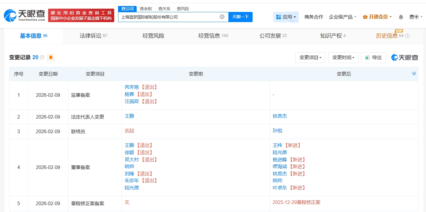 天眼查app显示,蓝梦邮轮关联公司上海蓝梦国际邮轮股份有限公司成立于2016年8月,法定代表人为林恩杰,注册资本约7711万人民币,经营范围包括邮轮港口服务、邮轮配套服务、国际船舶运输等,由福建中运投资集团有限责任公司、青岛聚融产业投资有限公司、舟山群岛国际邮轮港有限公司共同持股。法律诉讼信息显示,近期,该公司及法定代表人林恩杰因未按执行通知书指定的期间履行生效法律文书确定的给付义务,被限制高消费。案件流程显示,今年2月,该公司已因此案被执行11万余元。值得一提的是,该公司现有20余条被执行人信息。变更记录显示,今年2月,王鹏卸任该公司法定代表人,由林恩杰接任。