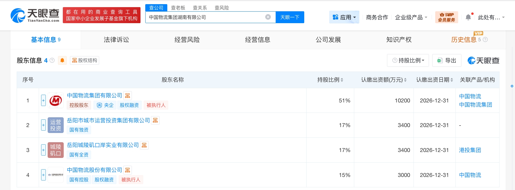 天眼查工商信息显示,近日,中国物流集团湖南有限公司成立,法定代表人为董旭,注册资本2亿人民币,经营范围包括道路货物运输、国内货物运输代理、国际货物运输代理、供应链管理服务等。股东信息显示,该公司由中国物流集团有限公司、中国物流股份有限公司、岳阳市城市运营投资集团有限公司、岳阳城陵矶口岸实业有限公司共同持股。