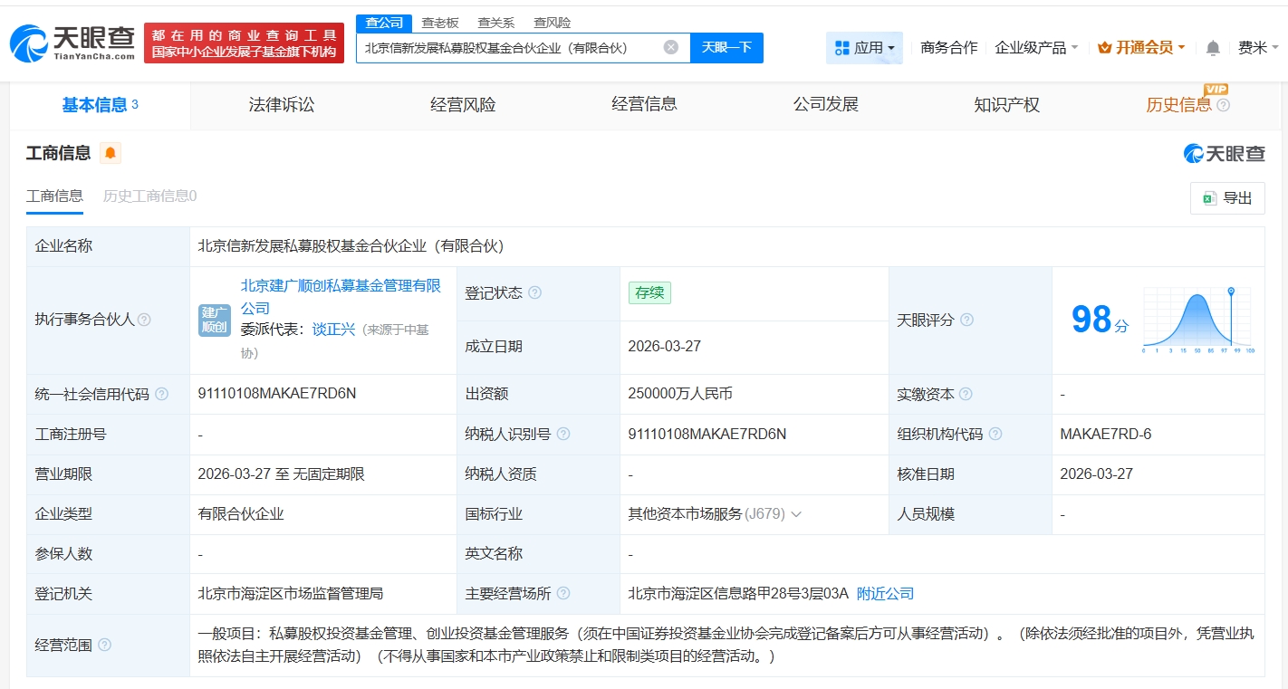 天眼查app显示,近日,北京信新发展私募股权基金合伙企业(有限合伙)成立,执行事务合伙人为北京建广顺创私募基金管理有限公司,出资额25亿人民币,经营范围为私募股权投资基金管理、创业投资基金管理服务。合伙人信息显示,该基金由中信金融资产(02799.hk)、北京紫光通信科技集团有限公司、北京建广顺创私募基金管理有限公司共同出资。