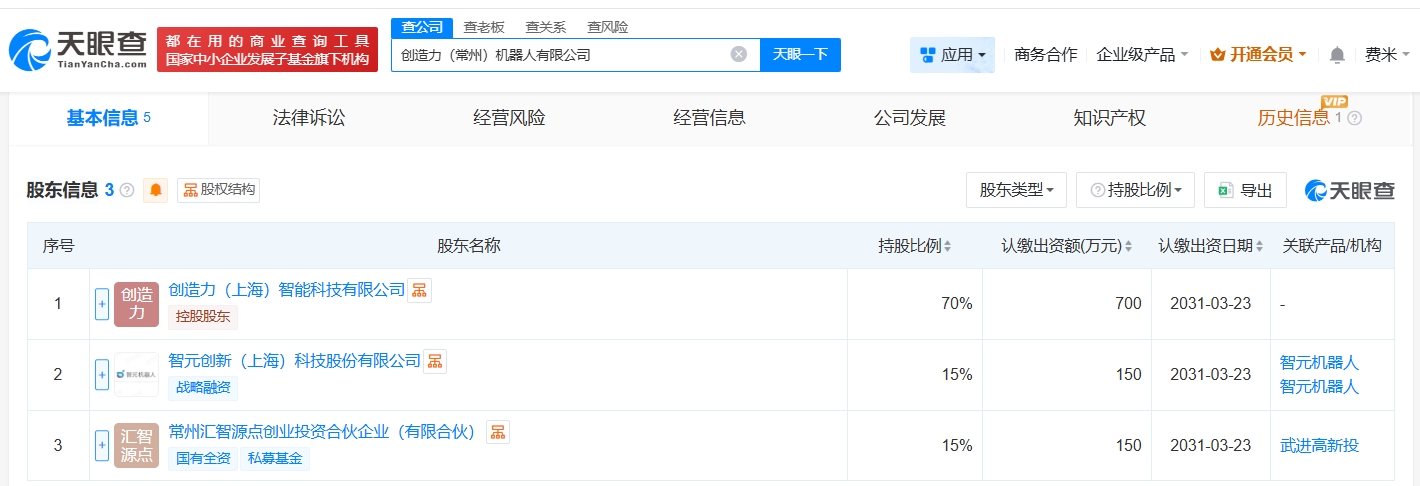天眼查app显示,近日,创造力(常州)机器人有限公司成立,法定代表人为王海兵,注册资本1000万人民币,经营范围包括服务消费机器人制造、工业机器人制造、人工智能理论与算法软件开发等,由创造力(上海)智能科技有限公司、智元机器人关联公司智元创新(上海)科技股份有限公司、常州汇智源点创业投资合伙企业(有限合伙)共同持股。