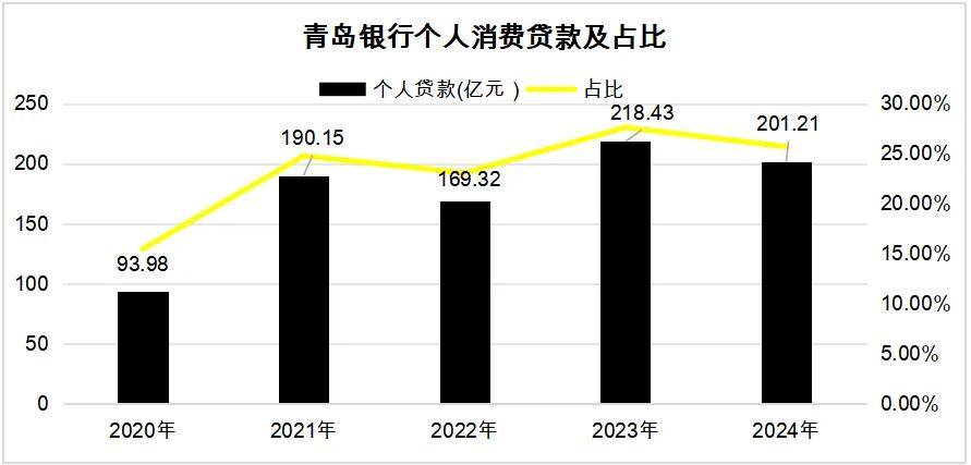 多管旗下的举措,显著拓展了青岛银行个人业务的创收创利空间。2020年-2024年,该行个人消费贷款从93.98亿元膨胀到201.21亿元,占零售贷款的比例从15.47%抬高到25.69%,最高的2023年占比达到27.62%。