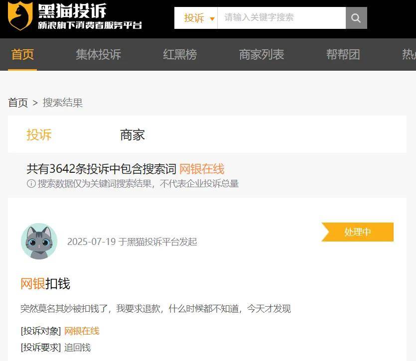 黑猫投诉平台显示,关于网银在线的投诉超3000条,有多起消费者投诉网银在线"无故扣款"等问题。