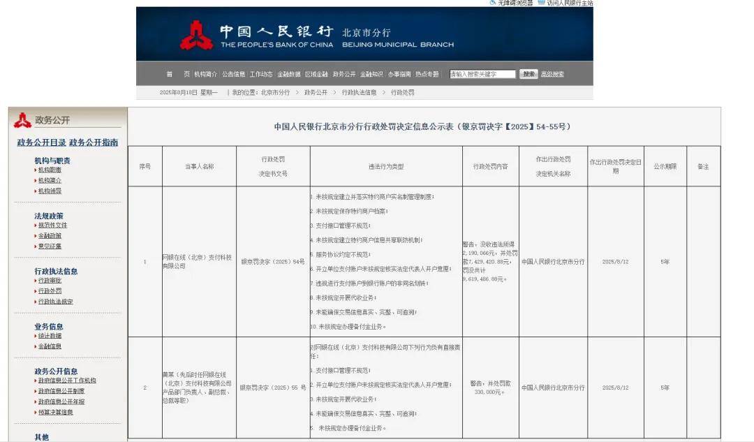 2025年8月15日,中国人民银行北京市分行公布了对网银在线(北京)支付科技有限公司(以下简称"网银在线")的行政处罚决定(银京罚决字〔2025〕54-55号),该公司因多项严重违法违规行为被处以警告、没收违法所得约219万元,并处罚款约743万元,罚没合计约962万元 。