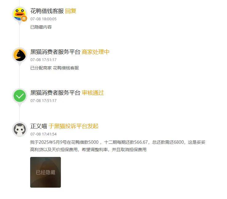在黑猫投诉平台上,有用户反映,2025年5月,其在花鸭借钱平台上借款5000元,十二期每期还款566.67元,总共需还款6800元。按此来计算,1800元借款成本占5000元本金的36%。对此,该用户表示,希望调整利率,并取消担保费用。