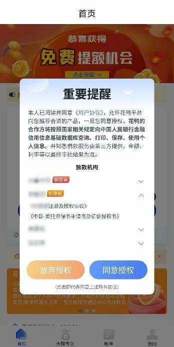 这意味着,“花鸭借钱”的运营模式并非依据借款人所填写的详细信息,运用科学的风控模型对借款人资质进行严谨审核,进而精准确定授信额度,并将其合理匹配给银行等资金方。而它采取的是一键授权的简便粗暴方式,将借款人的个人信息“共享”至其他助贷机构,这种做法不仅违背了金融行业规范的风险管理原则,也引发了对于借款人个人信息安全的深切担忧。
