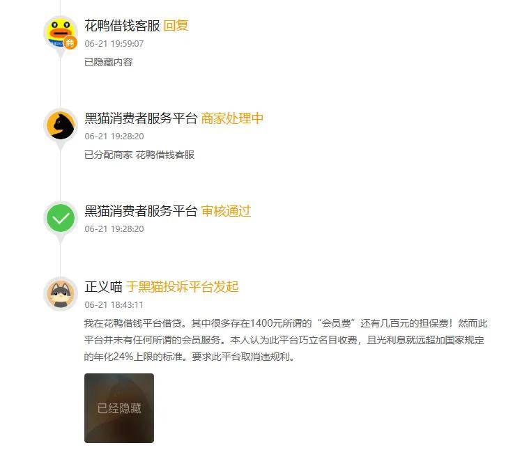 另一个投诉显示,借款人反映,在花鸭借钱平台借贷,其中存在1400元所谓的“会员费”还有几百元的担保费。然而,平台并未有任何所谓的会员服务。